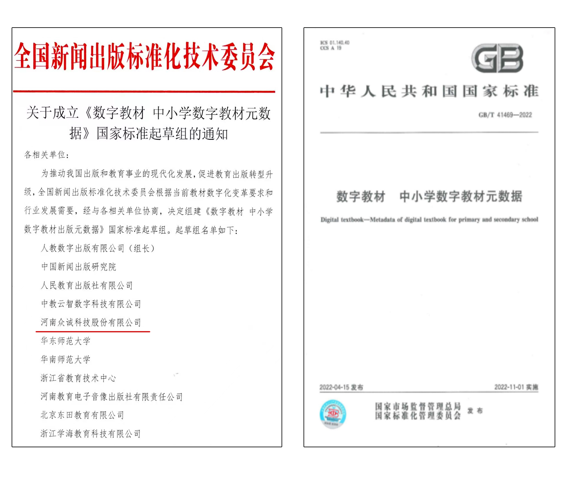 近日,国家标准GB/T 41469—2022《数字教材 中小学数字教材元数据》正式实施,该标准由国家市场监督管理总局、国家标准化管理委员会批准发布,为首批中小学数字教材国家标准之一,河南众诚信息科技股份有限公司(以下简称“众诚科技”)作为起草组成员单位,参与编制了该项国家标准。