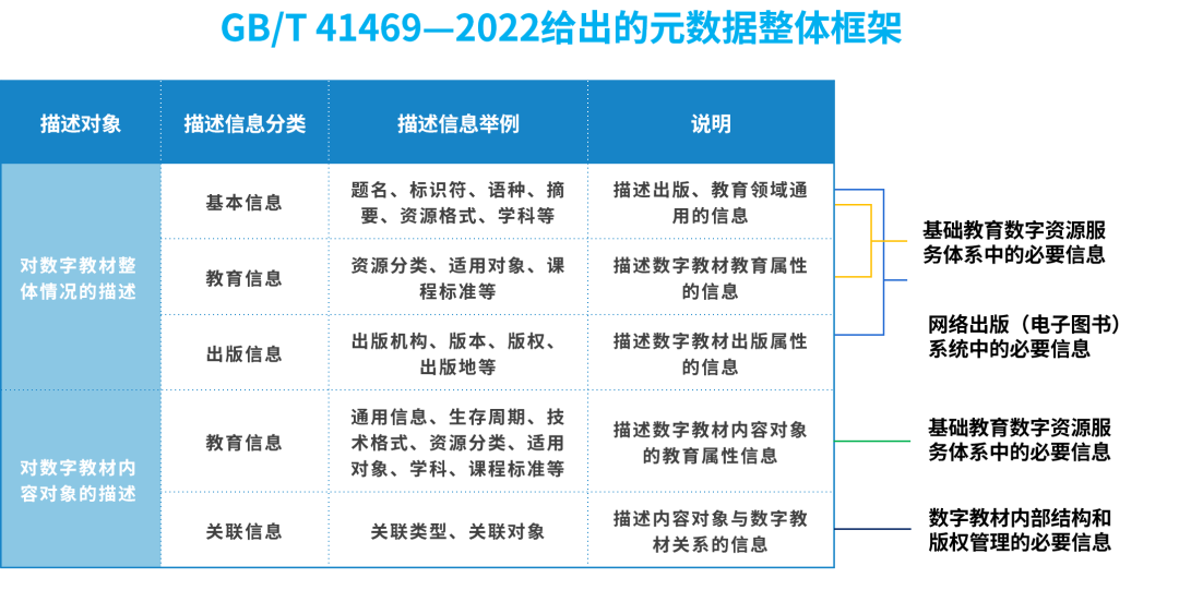 据悉,数字教材作为我国教材建设工作中的一部分,被纳入成为了教材创新工作之一,元数据作为数据资产的基础要素,是数字教材的“四梁八柱”。GB/T 41469—2022《数字教材 中小学数字教材元数据》标准文件系统、全面的对中小学数字教材进行的基础层面数据的阐述和规约,适用于中小学数字教材的开发、应用和管理,及中小学数字教材有关数据库的建设。