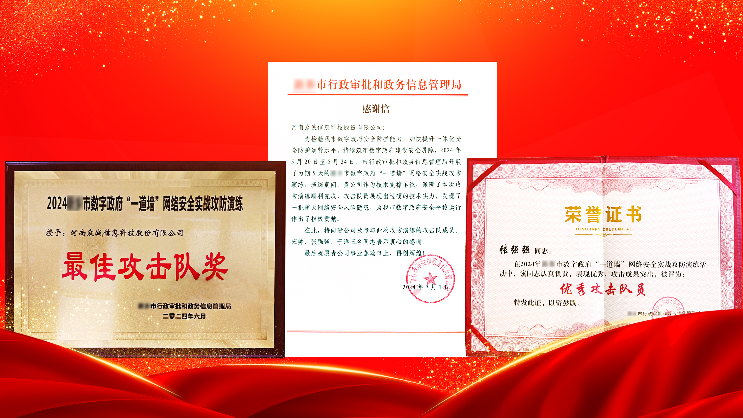 众诚科技凭借卓越的技术实力,圆满助力本次演练顺利落幕,荣获“最佳攻击队奖”团队殊荣及“优秀攻击队员”个人表彰,同时,某市特发感谢信一封,对众诚科技的贡献表示高度认可与诚挚感谢。